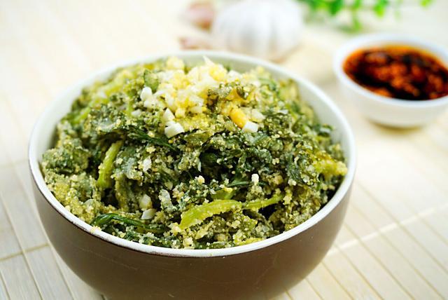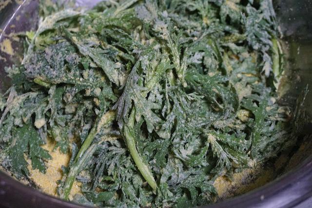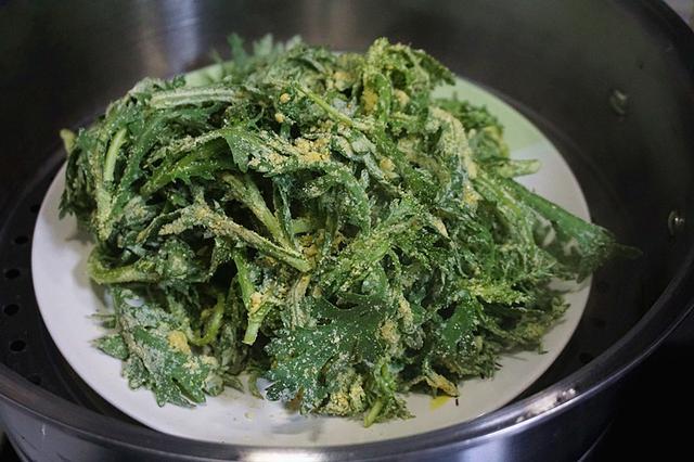 茼蒿丰富的粗纤维有助于肠胃蠕动,混合了玉米面的茼蒿,蒸熟后绵软顺滑,味道鲜美,蘸汁吃尤为香,还具有特别有效的清肠排毒作用,这可是秋季里减肥的上佳菜肴。