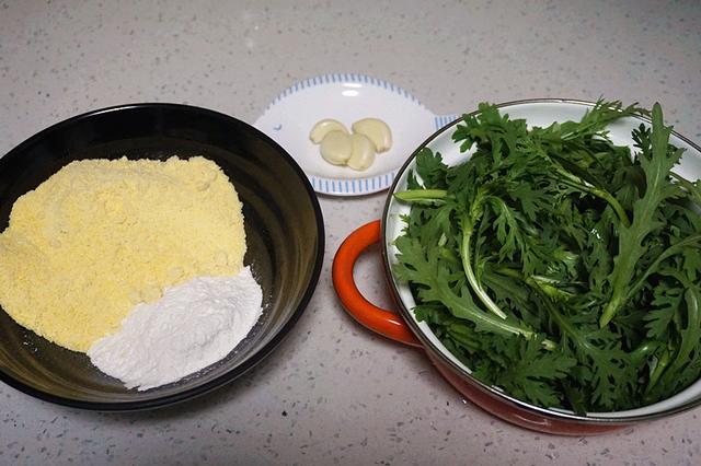 2、玉米面:面粉,比例是3:1,蒜4瓣切成碎末。