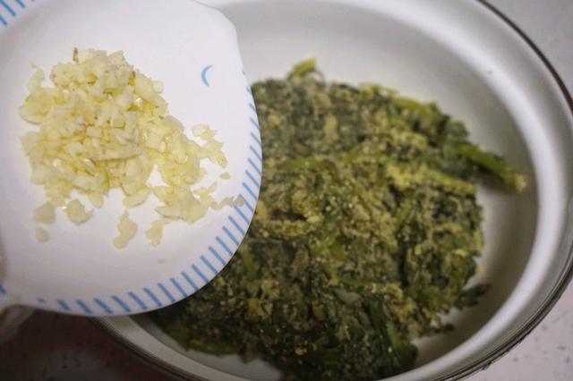 5、蒸好的茼蒿,倒入蒜末,适量香油,筷子搅拌均匀。