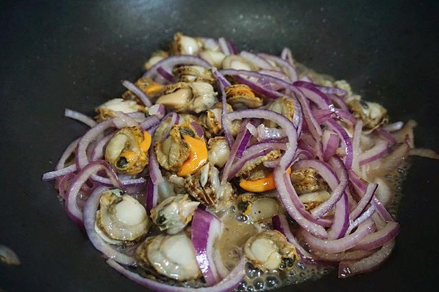 4、接着放入扇贝肉,快火煸炒出去水分, 炒出鲜味。
