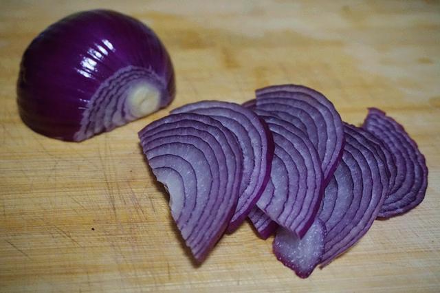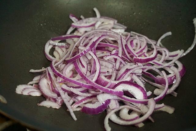 3、这道菜不用放葱姜,做热油锅,爆香洋葱丝。紫皮洋葱有着独特的甜葱味道,高温爆炒,能有效的去掉洋葱辣味。