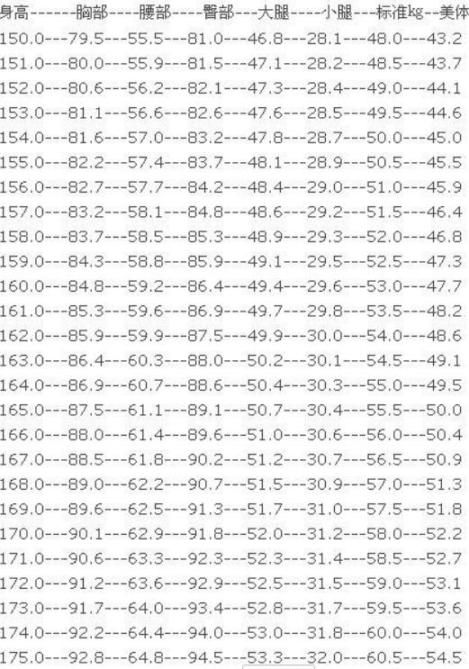下面给大家一个对照表,有不同身高,不同身体各个部分尺寸对应的腰部的标准,大家看下对比下自己的身材。