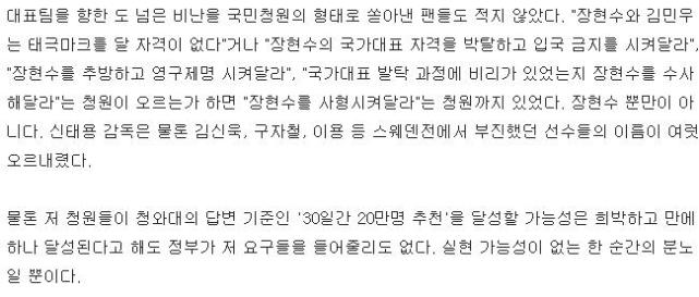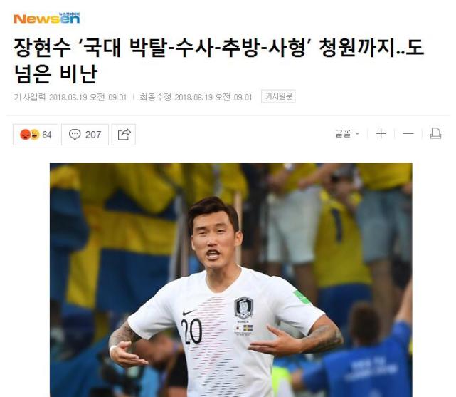 |   张贤秀眼神防守,目送对手打门   第26分钟,张贤秀再次出错,他一脚漫无目的的传球又高又飘,为了接好这个球,朴柱昊奋力争顶,结果拉伤了大腿,被金珉友换下。     张贤秀给朴柱昊传出刀山球,朴柱昊为了接好这个球,拉伤了大腿   无脑传球送队友上刀山金珉友鲁莽犯规送点   张贤秀的错误还在继续,下半场,张贤秀在禁区内无脑传球,金珉友不好处理,加之经验也不太足,为了解围鲁莽上抢,结果送给对手点球。客观的说,这并不是张贤秀的真实水平,但对于韩国队这场失利,张贤秀确实负有不可推卸的责任。     张贤秀解围失误,金珉友鲁莽放铲送点   韩国球迷要去总统府请愿:张贤秀滚出国家队   赛后,韩国将帅都成为球迷抨击的对象,球迷对张贤秀的批评尤甚。措辞稳重一点的也是“张贤秀和金珉友没有资格成为国家队选手”、“剥夺张贤秀的国家队选手资格,永久驱逐出队”。说的难听的直接就是“张贤秀滚出国家队”、“请将张贤秀判处死刑”。   张贤秀的糟糕表现,连带着恩师申台龙一起挨骂:“要调查一下张贤秀,看看国家队选手选拔过程中是否存在违法行为”。   除了张贤秀,具滋哲、金信煜、李镕等表现不佳的选手,都成为挨骂对象。   还有球迷为了“让张贤秀从国家队滚蛋”,呼吁大家去青瓦台总统府请愿。当然,韩国证府出手处罚足球运动员的可能性是不存在的,这更多的是球迷的一种愤怒。     韩媒截屏     韩国球迷辱骂张贤秀截屏   韩国球迷的心情可以理解,但做法并不值得提倡。看来,“文明看比赛,理性对输赢”在韩国实现的话,还有很长的路要走。  2/2   首页 上一页 1 2 |